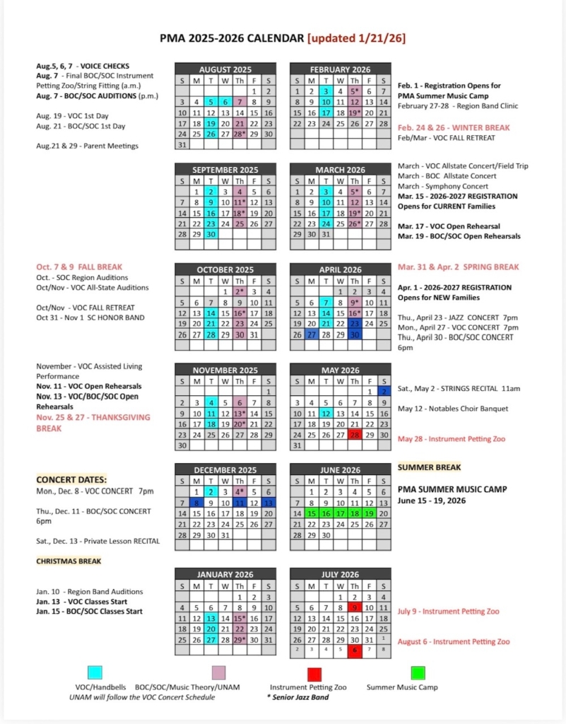 PMA 2025-2026 Calendar – Updated 1/21/26